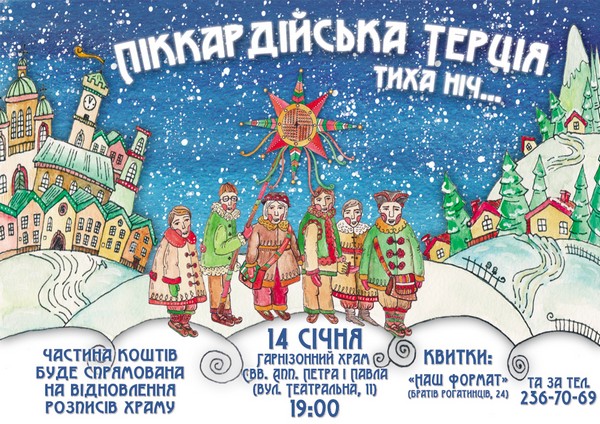 14 січня, у Старий Новий рік, у Львові, у Гарнізонному храмі святих апостолів Петра і Павла (відомий в історії як Костел Єзуїтів), що на вулиці Театральній, 11, відбудеться сольний концерт вокальної формації «Піккардійська Терція» - з різдвяною програмою «Тиха ніч…» (початок – о 19.00). читати повністю...